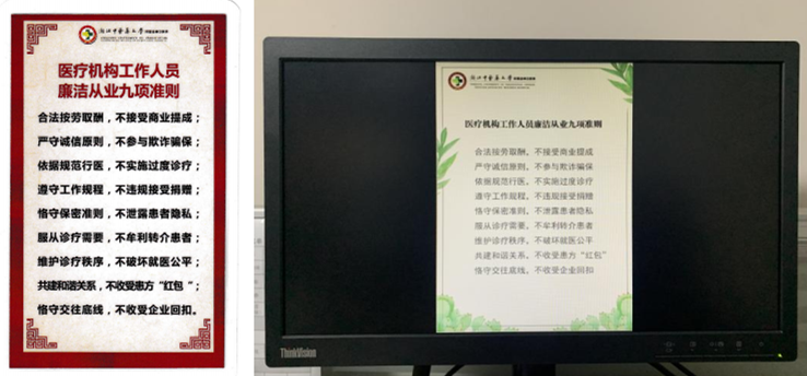 新出台的“九项准则”是在原来“九不准”从严治理内核基础上,从内容到形式的升级完善。它既涵盖了“九不准”的全部要求,又对新问题新情况和老问题新表现做了补充扩展。为了方便职工记忆学习,特别印制了口袋版随身卡片。同时,在医院门诊及综合楼大厅LED屏幕、走廊墙面、电脑屏保等媒介均加入了“九项准则”宣传内容,营造浓厚学习氛围。