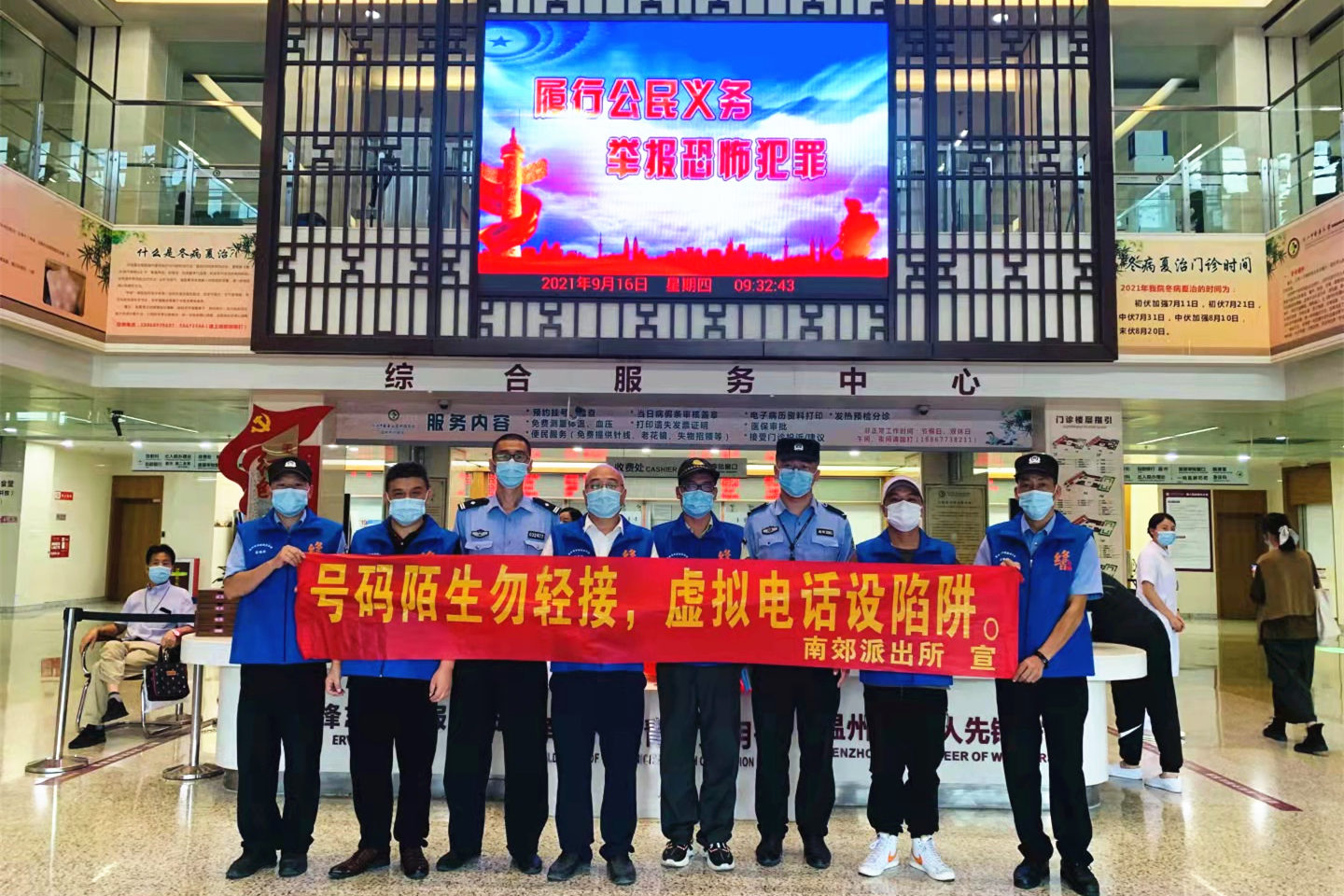9月16日和17日,保卫科联合南郊、水心派出所,对医院职工及来往院区的病患、家属发放反诈宣传册,主要介绍常见的电信诈骗类型、作案手段、特点以及防范要点,提醒群众不要轻信陌生人的电话和短信,同时告知大家不要向陌生人透露自己及家人的身份信息、银行卡密码、短信验证码等重要内容,坚决做到“不听、不信、不转帐”。