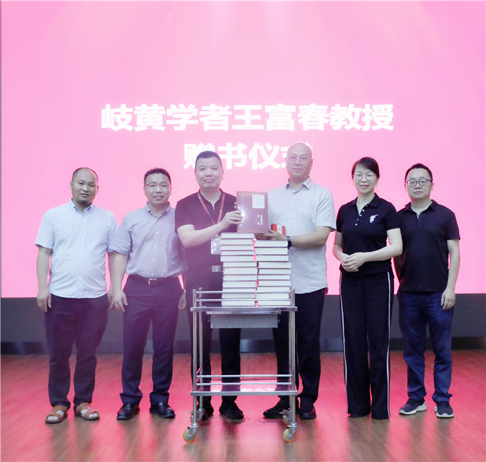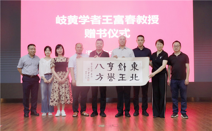 王富春教授赠送医院书籍,朱文宗院长代表医院回赠书法。