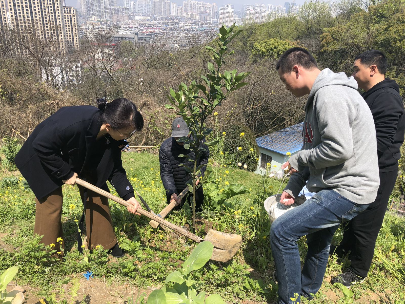 在支部书记章国伟同志和陈炳、孙云两位院长助理的带领下,水心景山党支部20多名党员来到了小妲己直播 景山院区后山上。去年植树节大家曾在此种下过40多株果树苗,现在小树苗都已经长高了,有的刚发牙,有的已经开了花。大家热情高涨,纷纷脱下外衣,撸起袖子,拿起铁锹。有的开始除草移植,有的刨坑挖土,有的施肥浇水,配合默契。经过大家的努力,为40多株花果树除了草、施了肥、培了土。一排排整齐的花果树,在风中摇摆着树枝,尽显春天的生机勃勃。